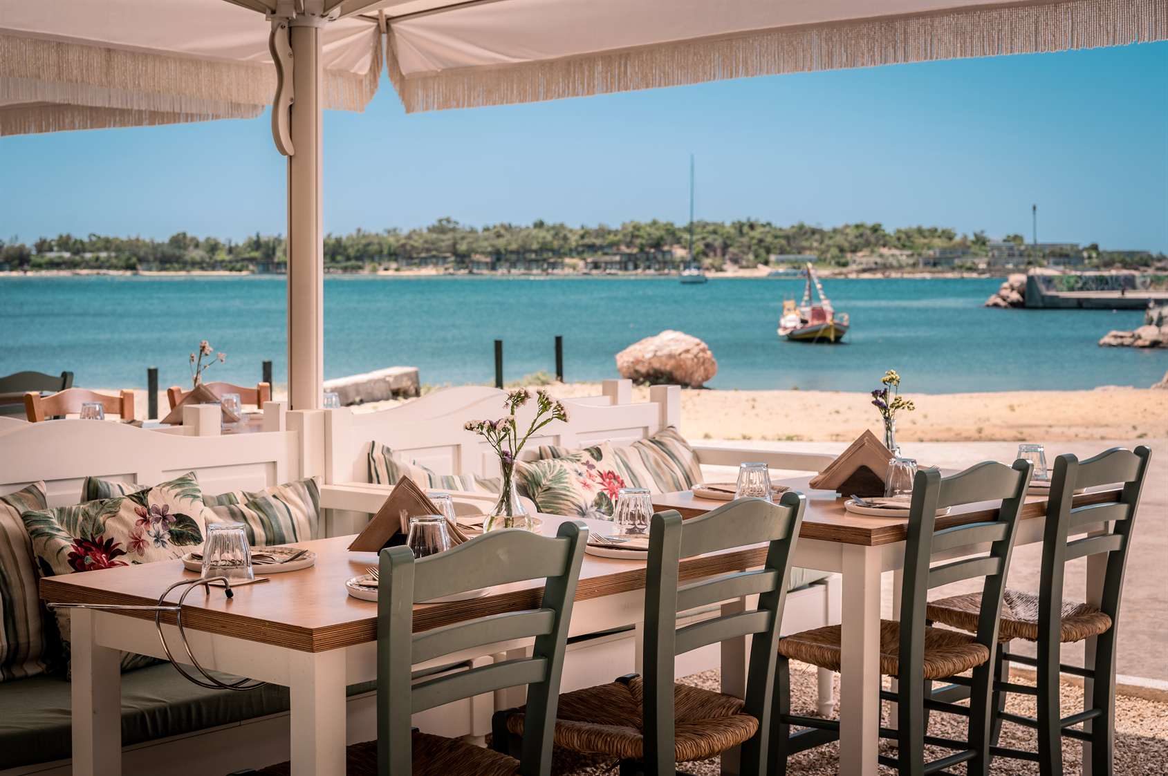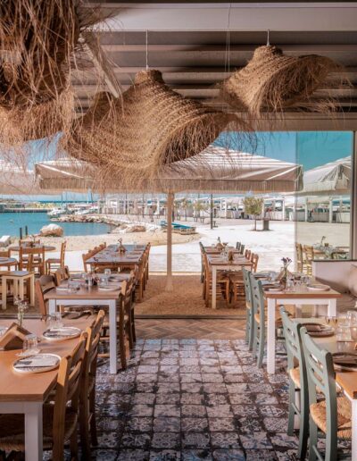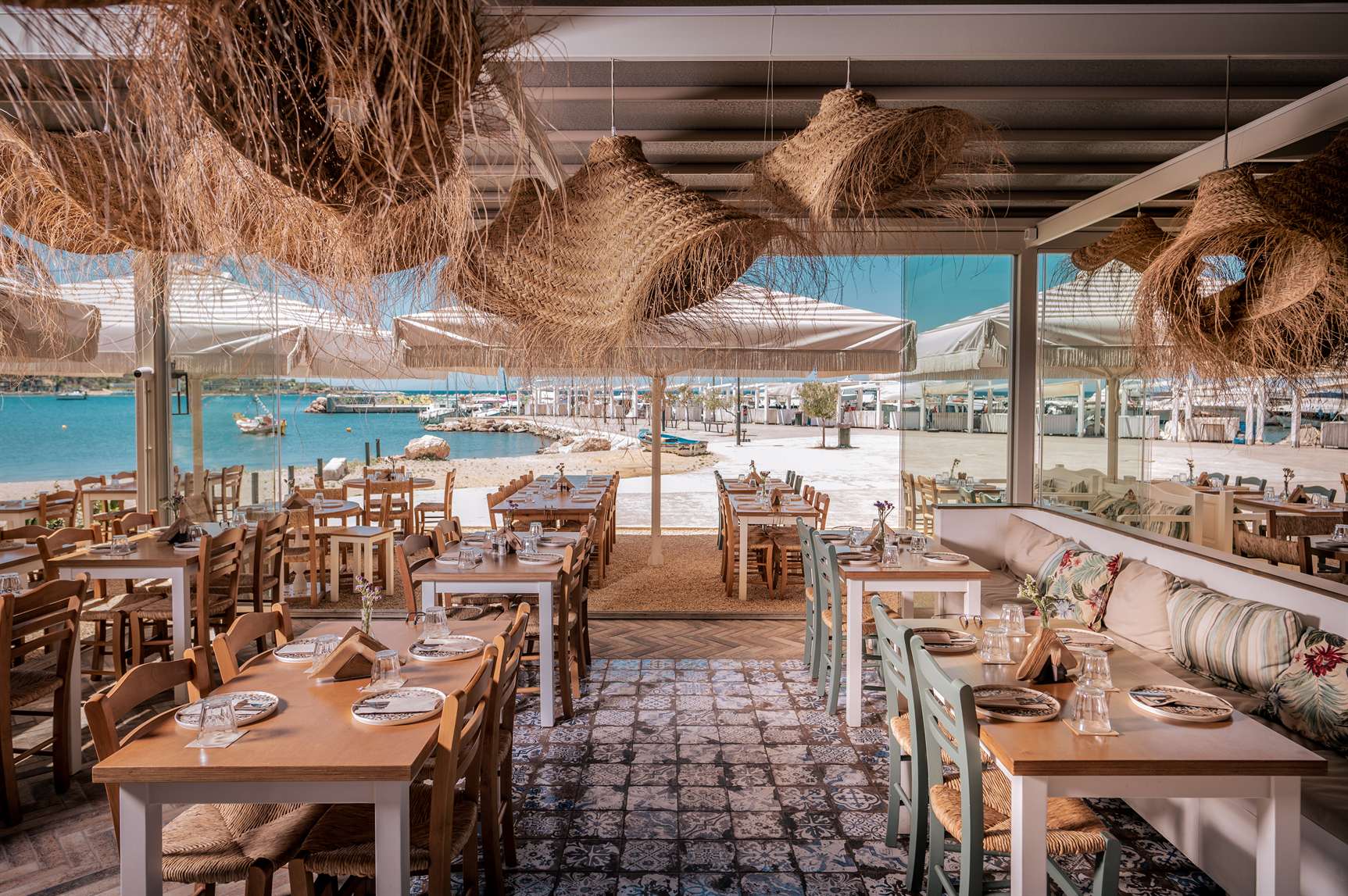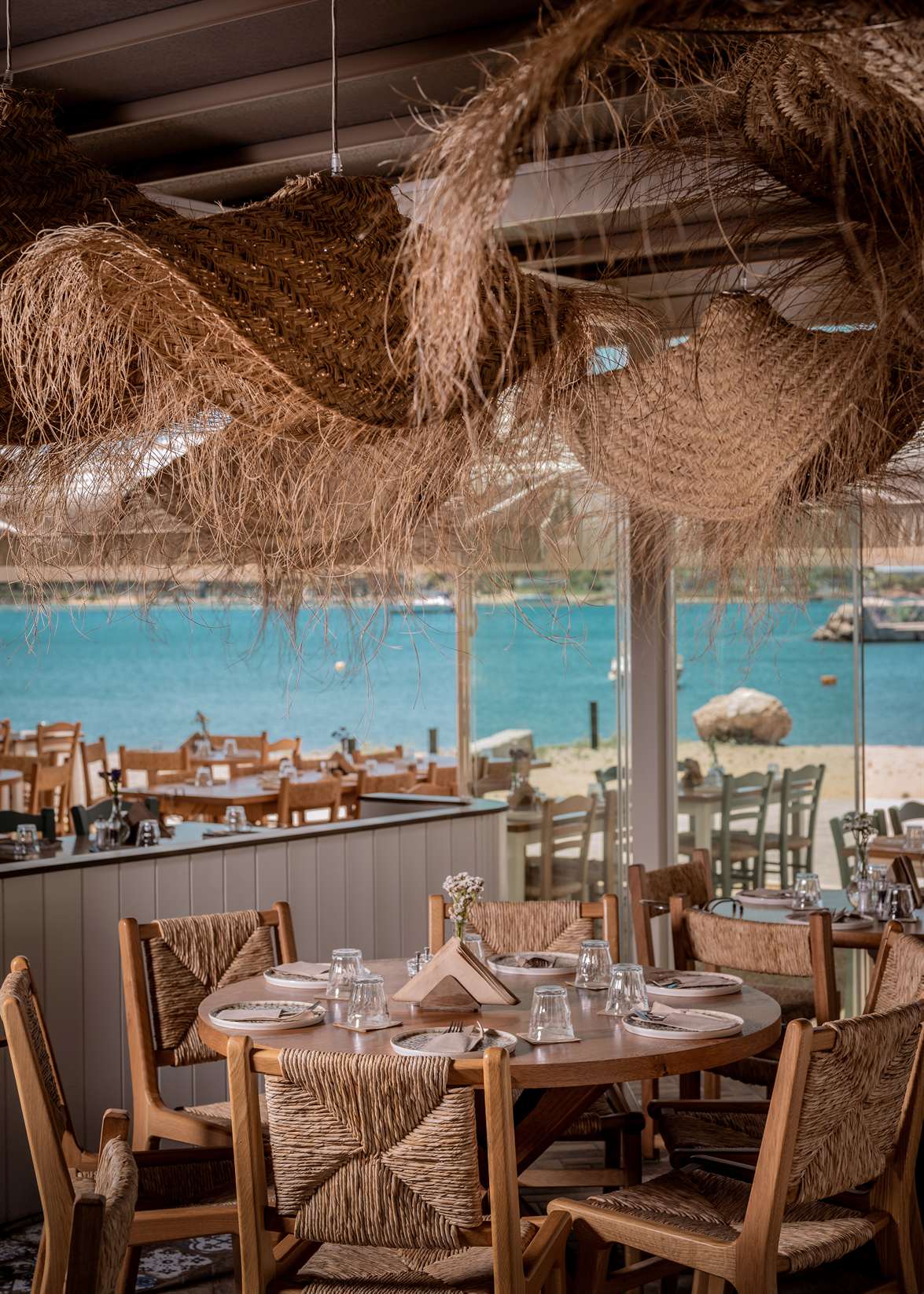 Τα χαλίκια στους εξωτερικούς χώρους δείχνουν το δρόμο προς τη θάλασσα, ενώ τα στοιχεία διακόσμησης – οι αντίκες, τα κιούπια, τα ψάθινα φωτιστικά, οι κιούρτοι ντυμένοι με λινάτσες – λειτουργούν ως ευθείες αναφορές στον τρόπο ζωής των ψαράδων.
