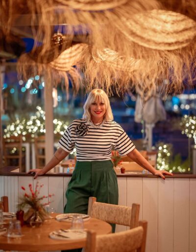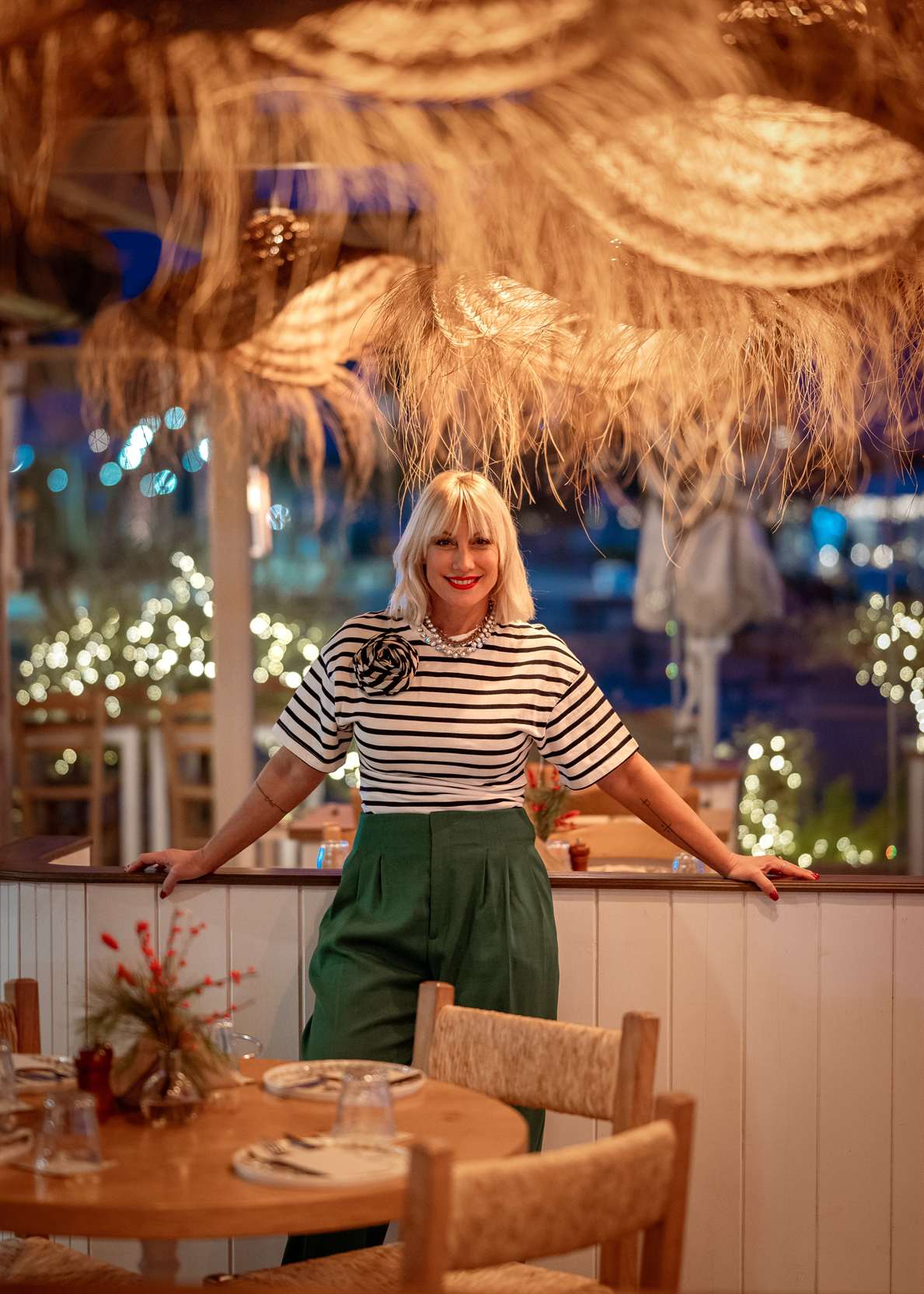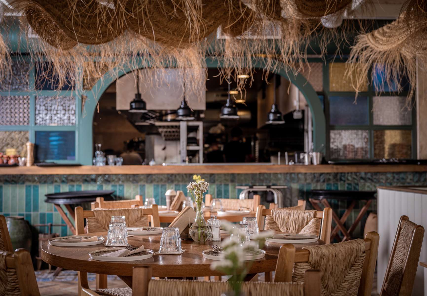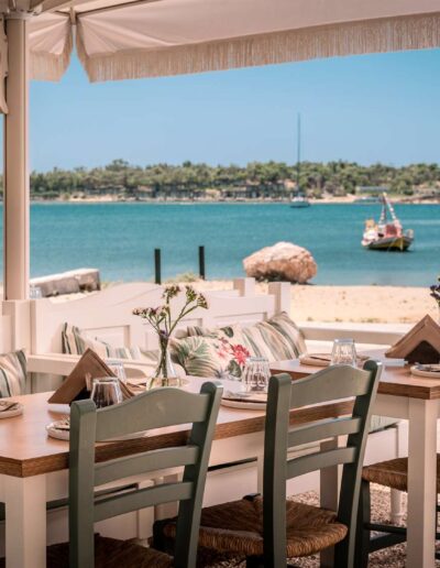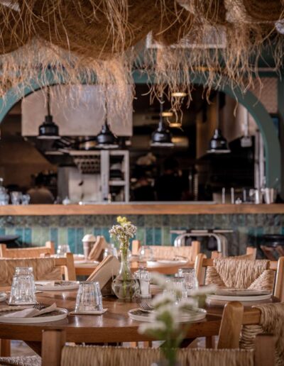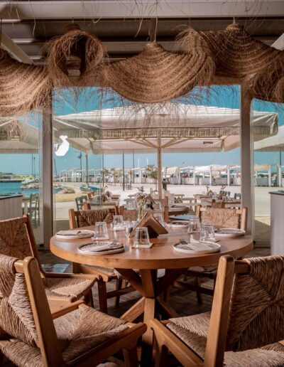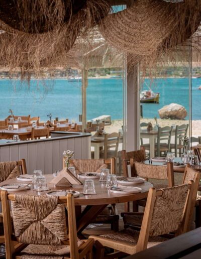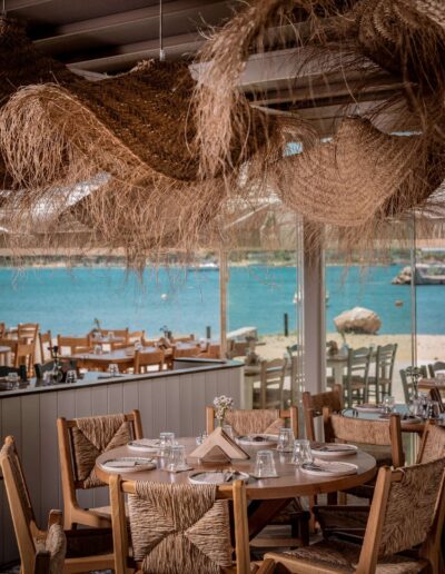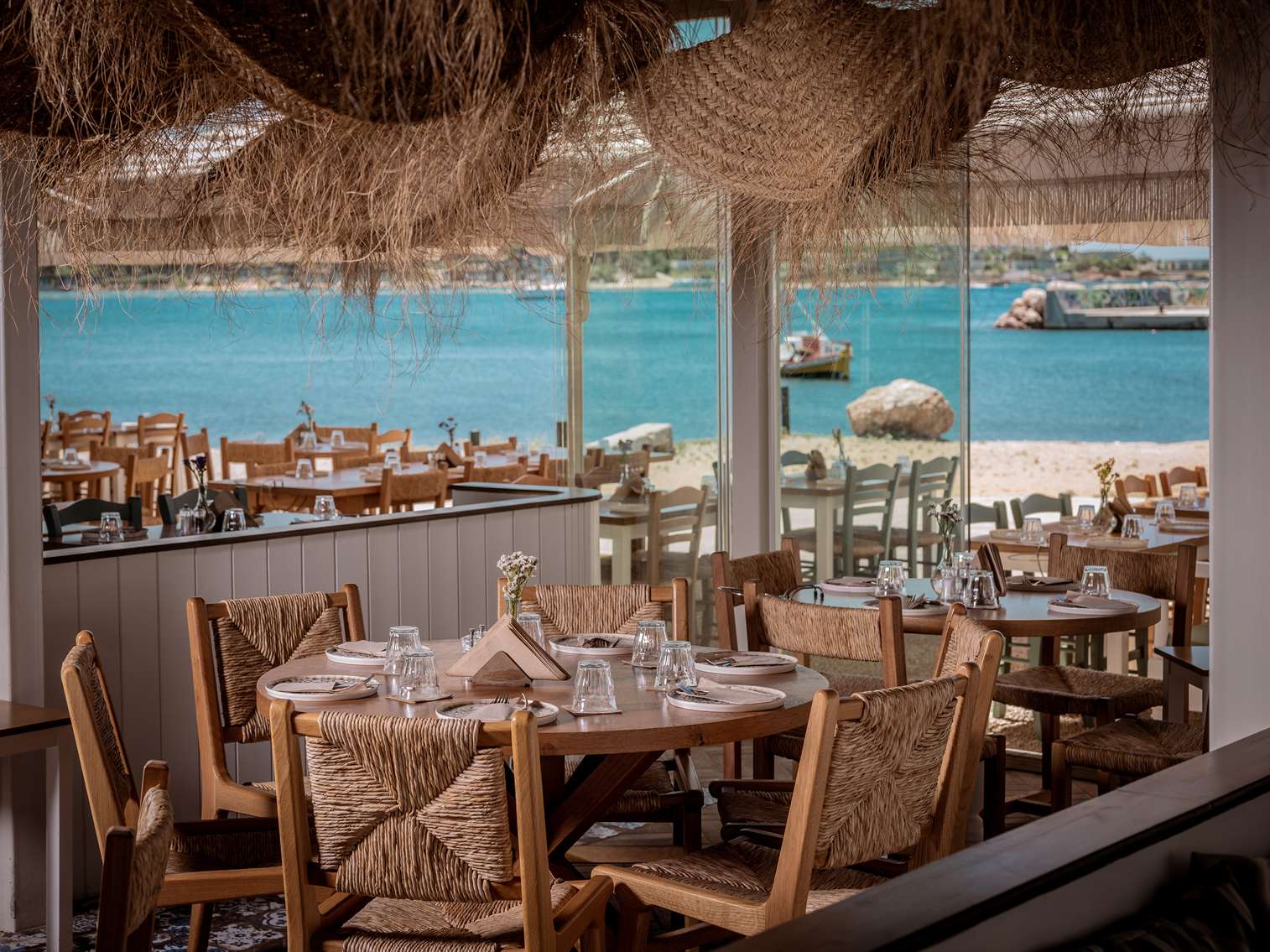 Τα χαλίκια στους εξωτερικούς χώρους δείχνουν το δρόμο προς τη θάλασσα, ενώ τα στοιχεία διακόσμησης – οι αντίκες, τα κιούπια, τα ψάθινα φωτιστικά, οι κιούρτοι ντυμένοι με λινάτσες – λειτουργούν ως ευθείες αναφορές στον τρόπο ζωής των ψαράδων.