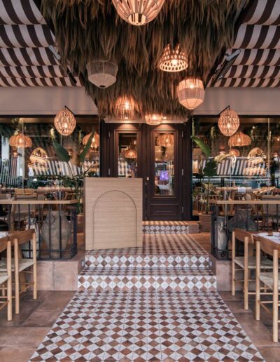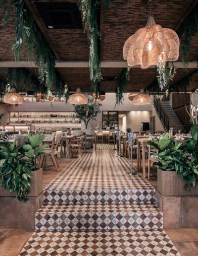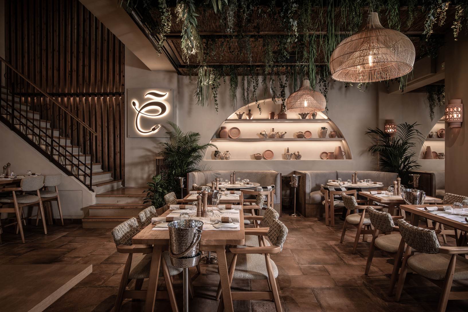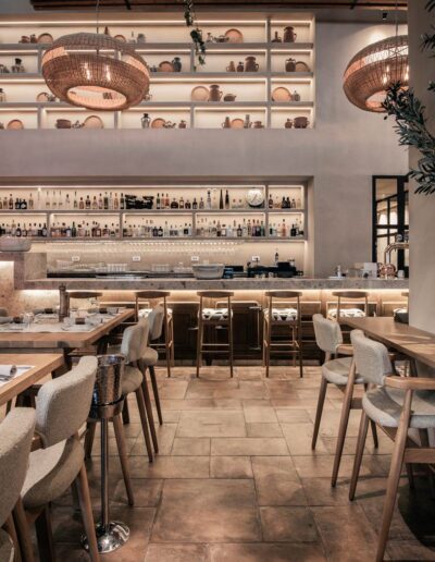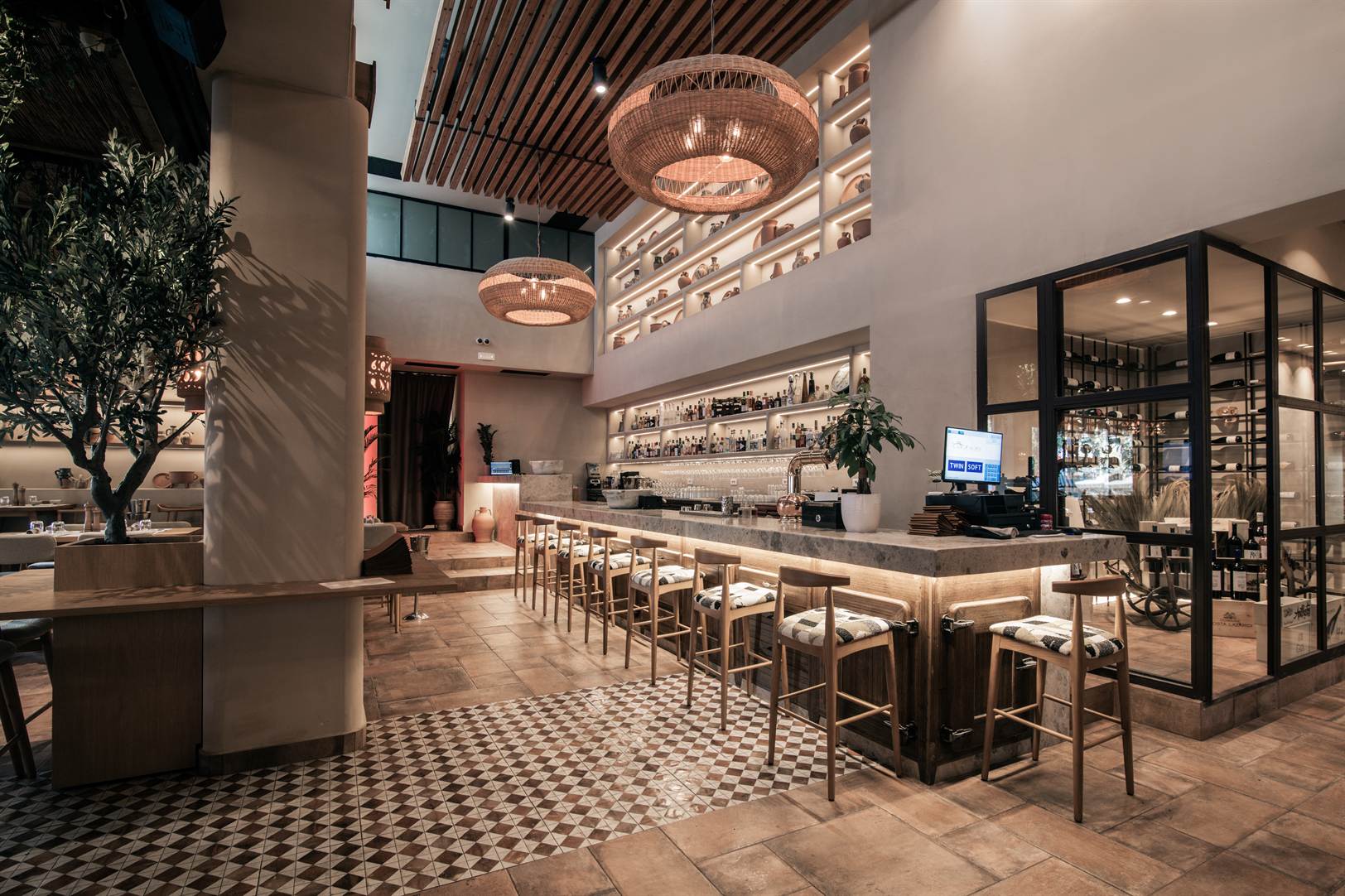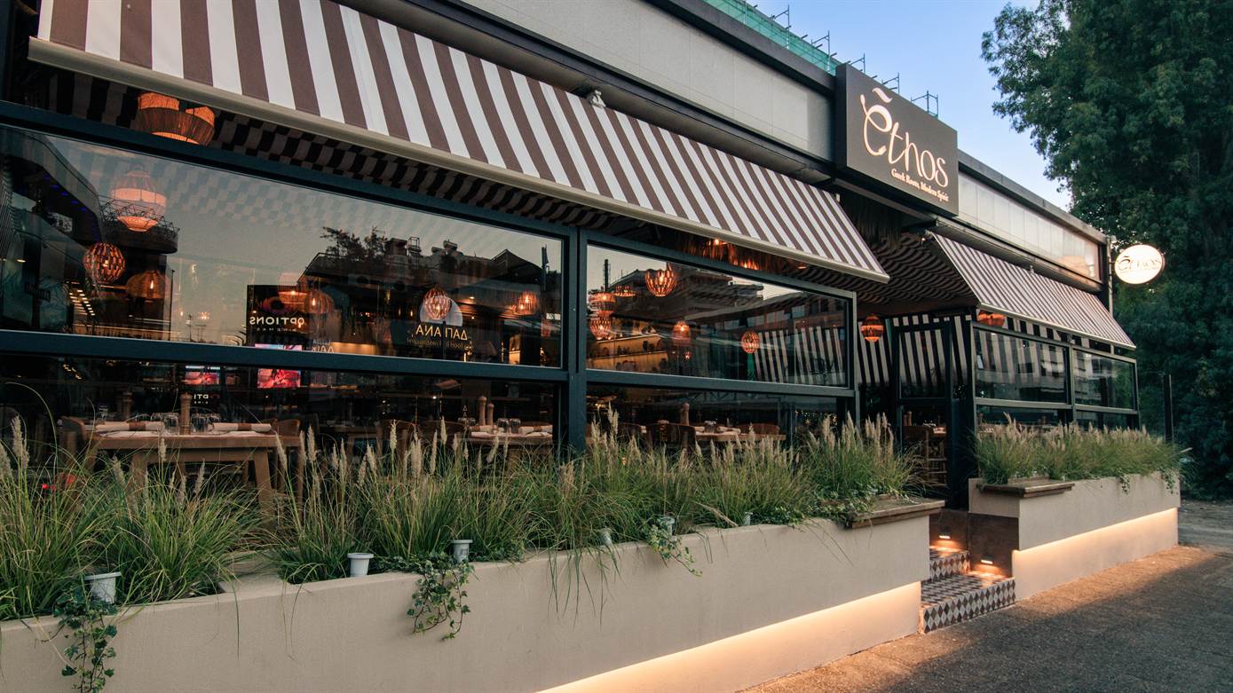 Το Ethos ξεχωρίζει για την αρμονική συνύπαρξη φυσικών υλικών, όπως το ξύλο και η ψάθα, με μοντέρνες αρχιτεκτονικές γραμμές. Τα φυτά που κρέμονται από την οροφή δημιουργούν μια αίσθηση φρεσκάδας και συνδέουν τον χώρο με τη φύση, ενώ οι πήλινες διακοσμήσεις στις ενσωματωμένες ραφιέρες προσδίδουν μια παραδοσιακή και αυθεντική νότα.
