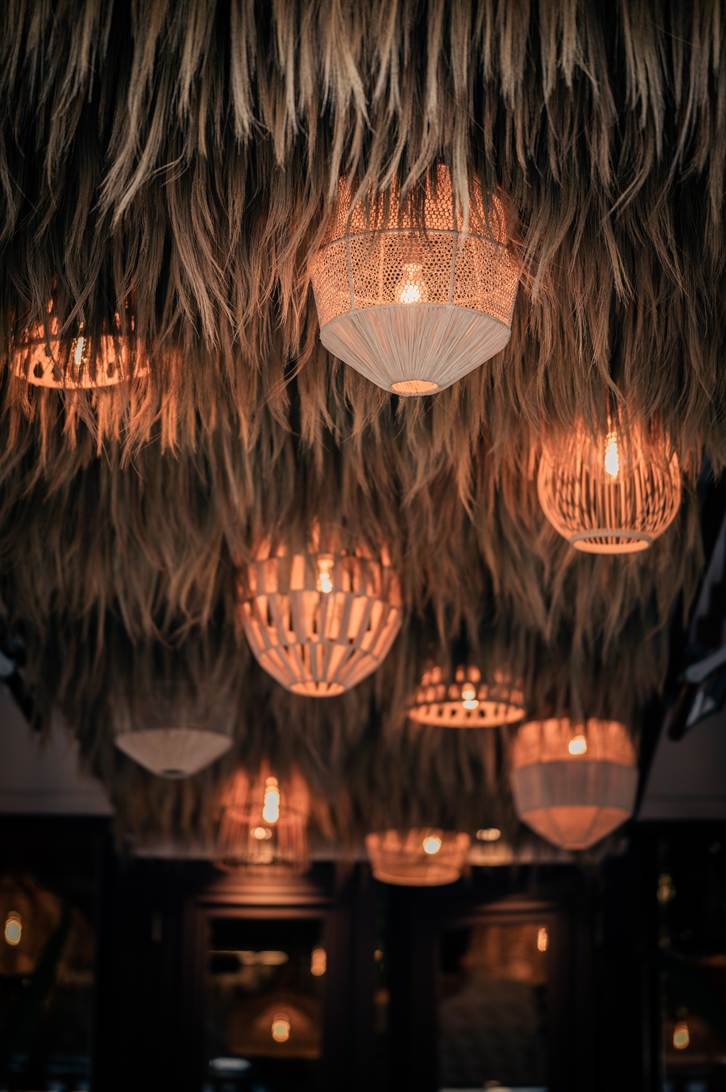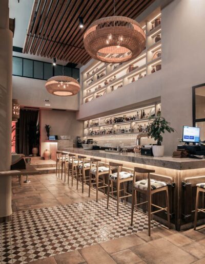 Ο ζεστός και διακριτικός φωτισμός , με κρεμαστά φωτιστικά από φυσικά υλικά ενισχύουν την ατμόσφαιρα χαλάρωσης. Τα γεωμετρικά σχέδια στα πλακάκια δαπέδου προσθέτουν ένα στοιχείο δυναμισμού και κομψότητας, ενώ οι καθαρές γραμμές των επίπλων ολοκληρώνουν το σύγχρονο ύφος του χώρου.